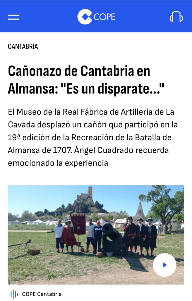 Un cañón perteneciente al Museo de la Real Fábrica de Artillería de la Cavada, fue protagonista en la localidad albaceteña de Almansa en la 19ª edición de la “Recreación de la Batalla de Almansa” de 1707. Miembros de la Asociación de Amigos del Museo participaron recientemente en la representación, portando con orgullo la bandera de La Cavada, y por extensión de Cantabria.